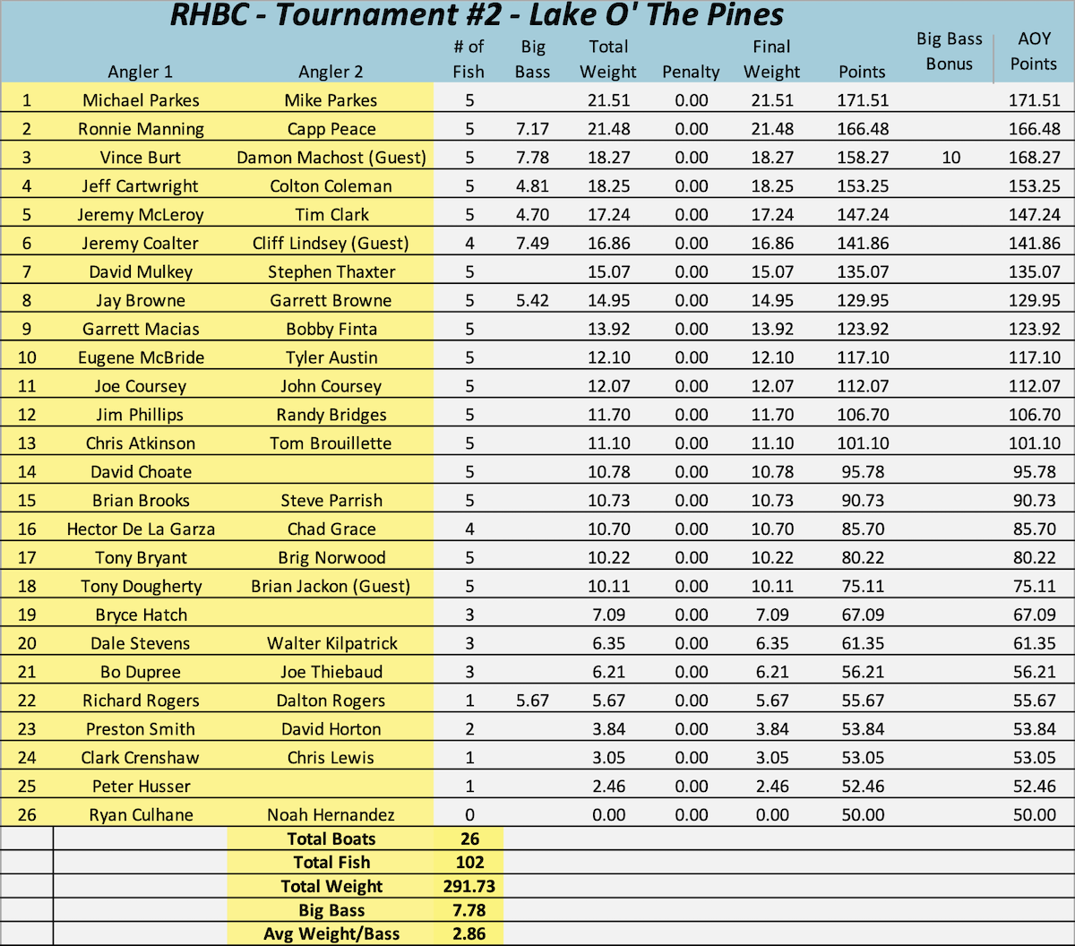 The Ray Hubbard Bass Club held our second members only tournament of 2025 last Saturday March 8th, on Lake O’ The Pines. The weather was less than favorable. Cold, windy and off and on rain. Only one brief stop down for the tail end of a thunderstorm that went over. We still had 26 boats come out in those conditions and fishing was very good for most. 16 limits were brought to the scales and some big ones were caught too with three over 7 pounds! When all was said and done the team of Michael and Mike Parkes came out on top with a great bag of 21.51 pounds. Their margin of victory was only .03 pounds! Big bass of the tournament was a 7.78 toad weighed in by Vince Burt and Damon Machost.