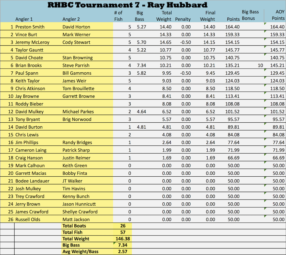 The Ray Hubbard Bass Club held our seventh members only tournament of the year last Saturday August 14th on our home lake Ray Hubbard. 26 boats came out to fish. The lake has been fishing very tough and Saturday was no exception. Only 5 limits were brought to the scales although there were some good ones weighed in. The day started hot and muggy and then 30 minutes before last cast a monster thunderstorm rolled in and chased everyone off the water. It poured for 90 plus minutes and you will see in the pictures the heavy rain falling while we weighed in under the patio at Chandlers. A few of the pictures had some drops on the lens. I apologize for that but no one had any type of dry cloth to clean the lens. At the end of the day. the team of Preston Smith and David Horton brought home the gold with a solid sack weighing 14.40 pounds. Big bass of the tournament was a 7.34 hawg weighed in by Brian Brooks and Steve Parrish.